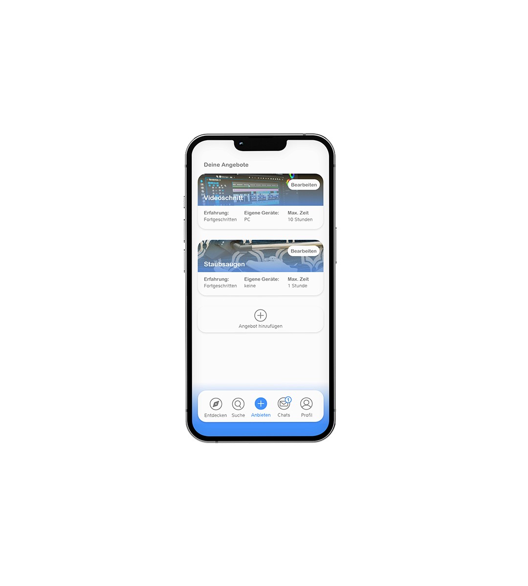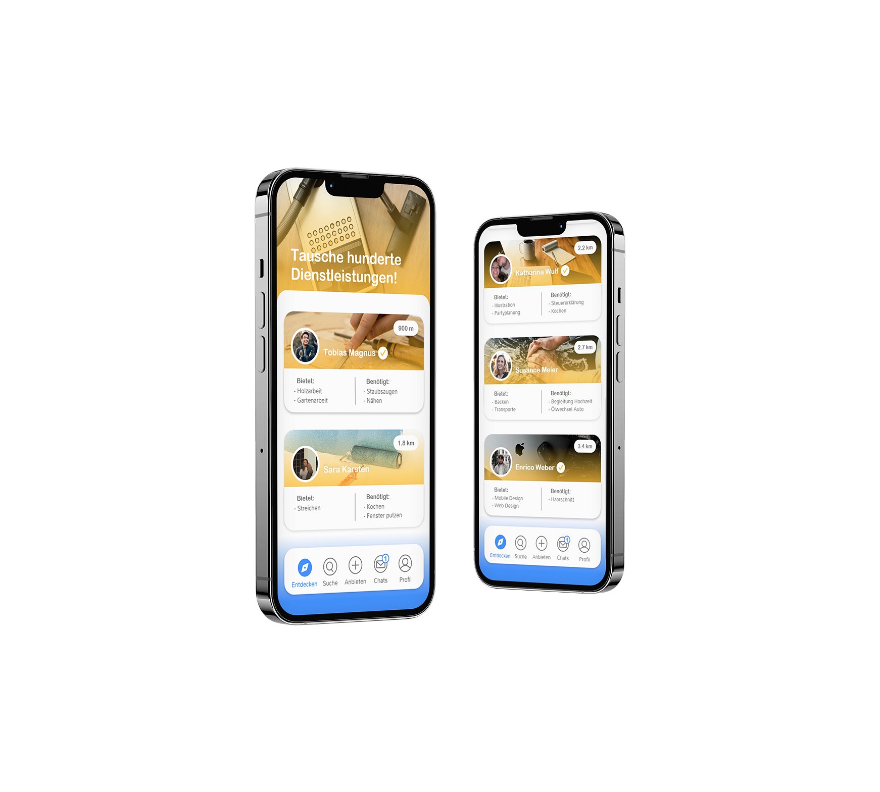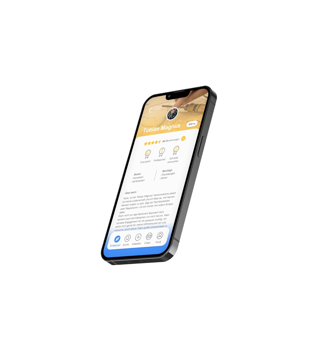The aim of the project was to design and prototype an app that makes it possible to exchange everyday services with people from the surrounding area. In the app it should be able to submit search requests for services and view other people's search requests after creating a user profile and completing a verification process.