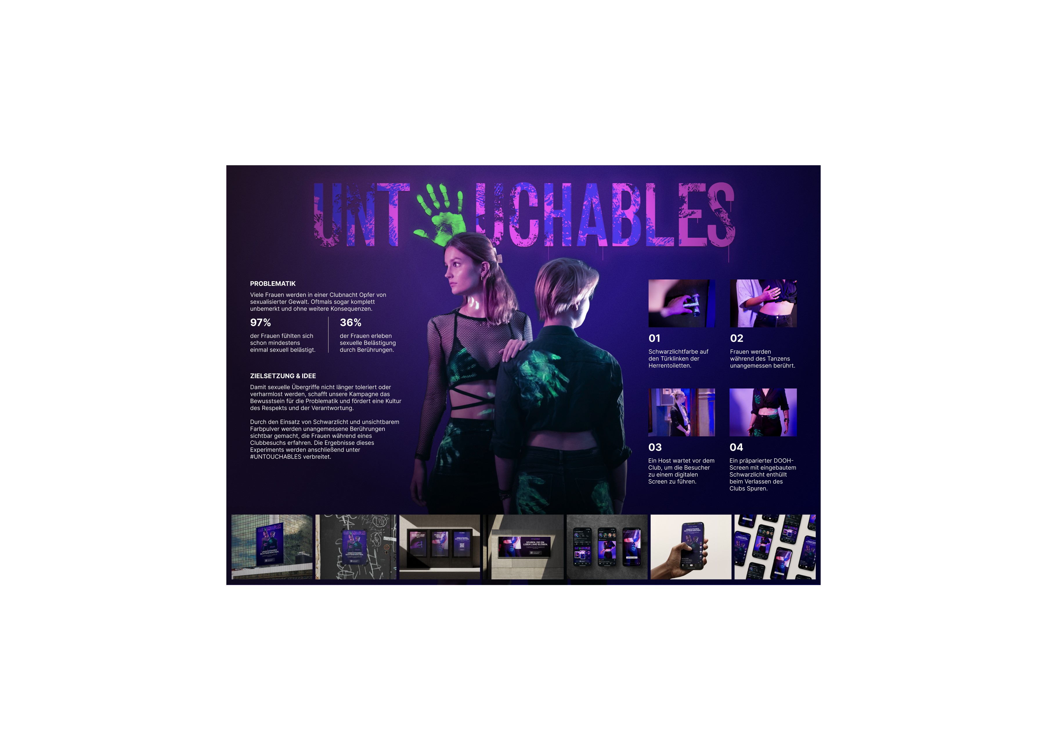 Black light and invisible coloured powder are used to mark inappropriate touching that women experience during a club visit. A DOOH installation makes these assaults visible.